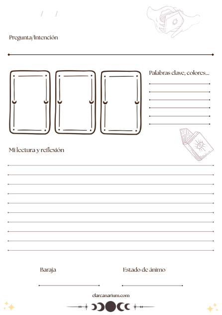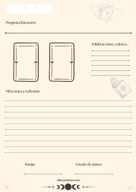 He creado un diario de tarot imprimible para que tengas un espacio ordenado y práctico donde registrar tus tiradas y reflexiones.